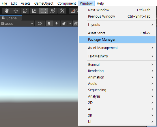 볼트 에셋을 임포트할 프로젝트를 열고 Window - Package Manager 를 선택합니다.