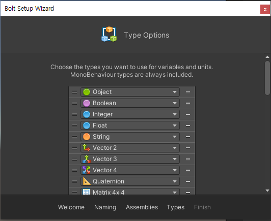 변수, 단위에 사용될 타입을 선택하는 화면입니다.