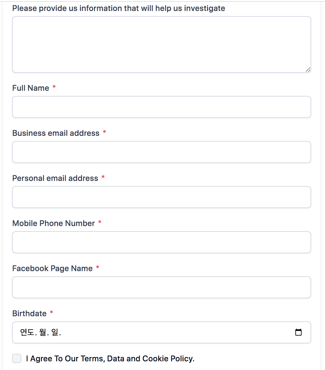 메타 페이지로 연결되더니 뭐 대충 이런 정보를 적으라고 하더라고요.