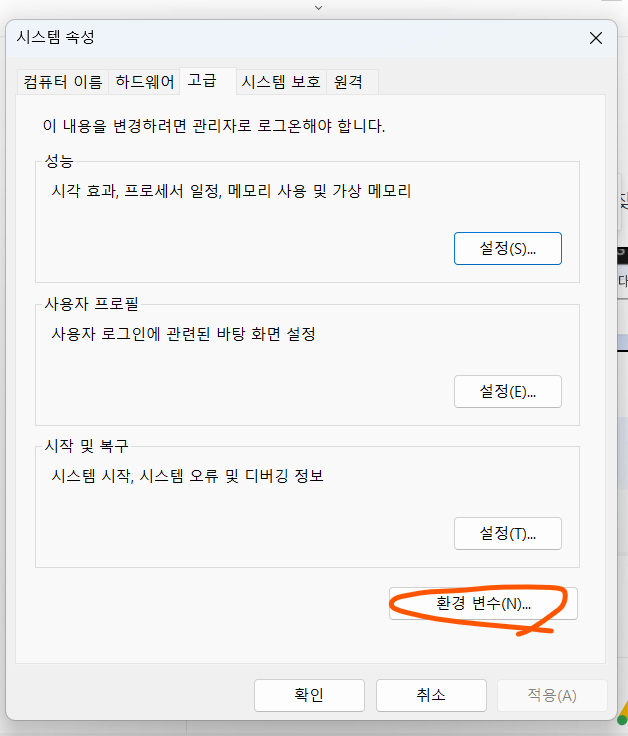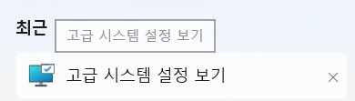 - 작업 표시줄 검색창에 "고급 시스템 설정"을 찾아서 선택