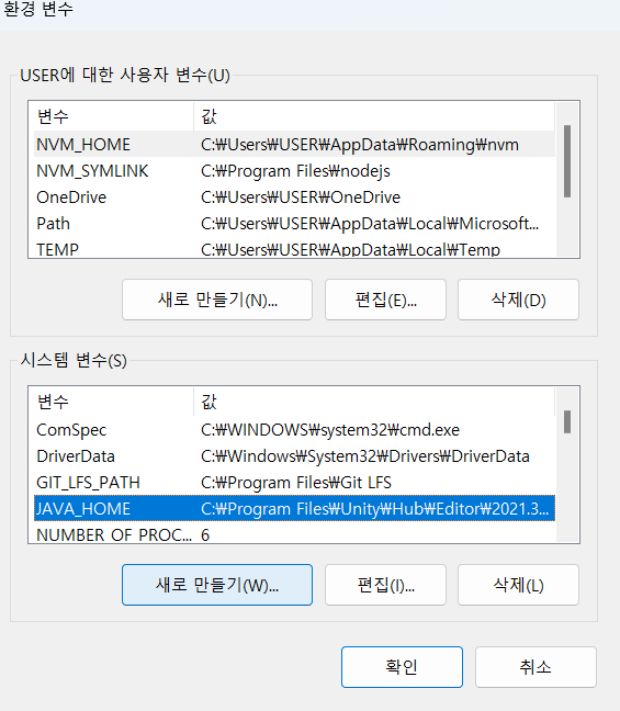 - 변수 이름에는 "JAVA_HOME"을 입력하고 변수 값은 유니티 에디터에서 "Edit → Preferences.. → External Tools → JDK 경로 패스 카피" 해서 넣어주면 됩니다.