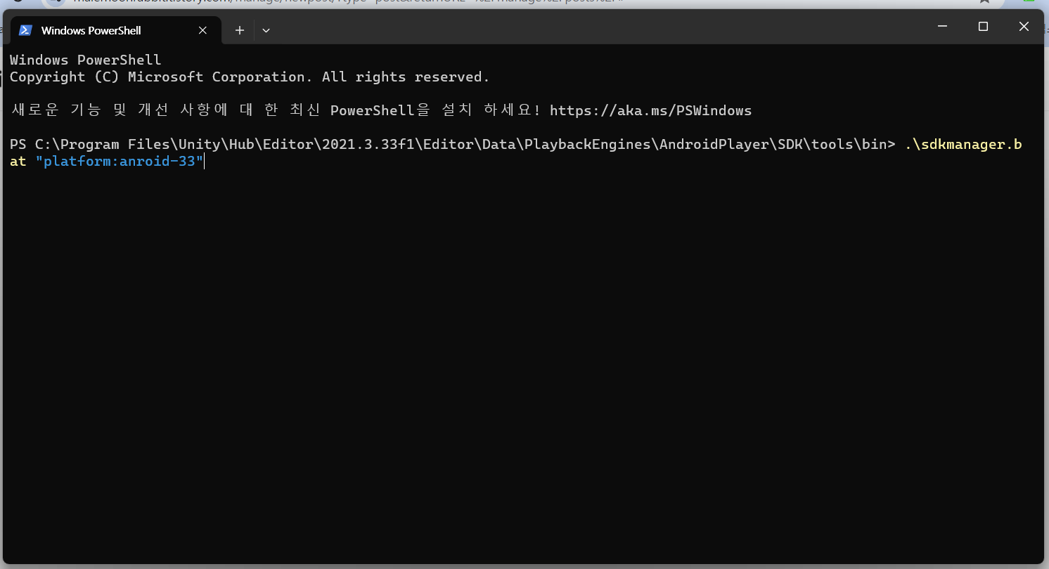 환경설정이 가장 중요하다. 해당 유니티 버전에 해당하는 Java를 환경설정 해줘야 cmd에서 sdkmanager가 제대로 실행 됐다.