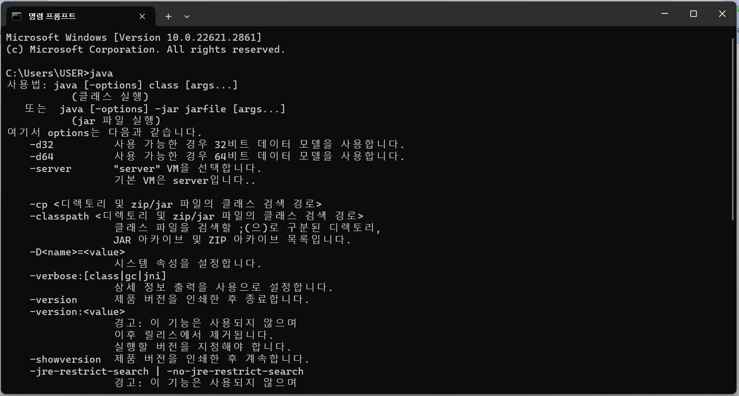 - 완료 후 Cmd에서 java를 입력하면 나오는 모습 ( 모두 설정하고도 해당 화면이 나오지 않는 다면 컴퓨터 재시작을 권유드립니다.)