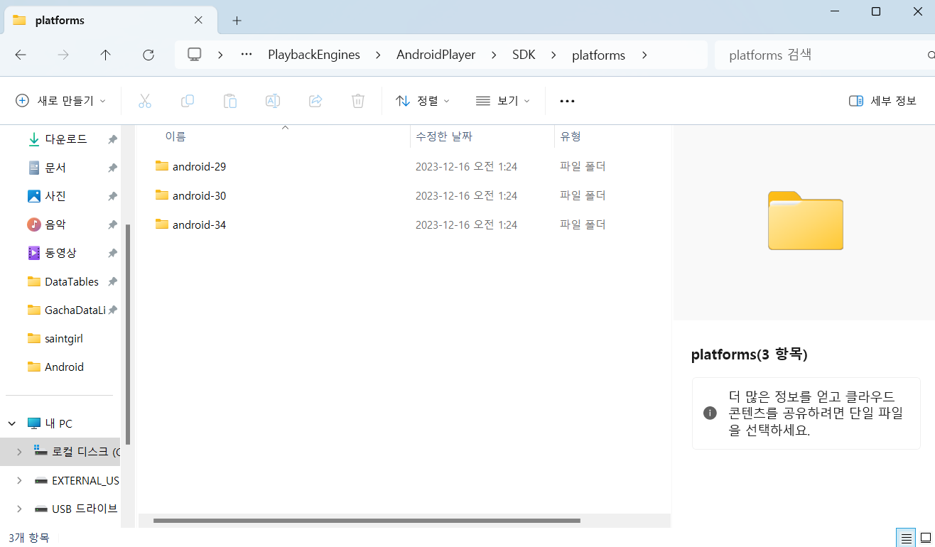 - 제대로 업데이트가 되었다면 \SDK\platforms 경로에 해당 버전이 보일 겁니다.
